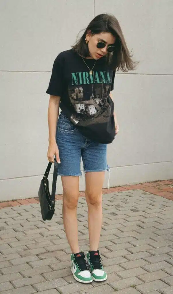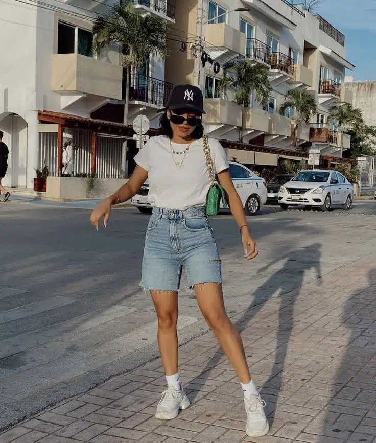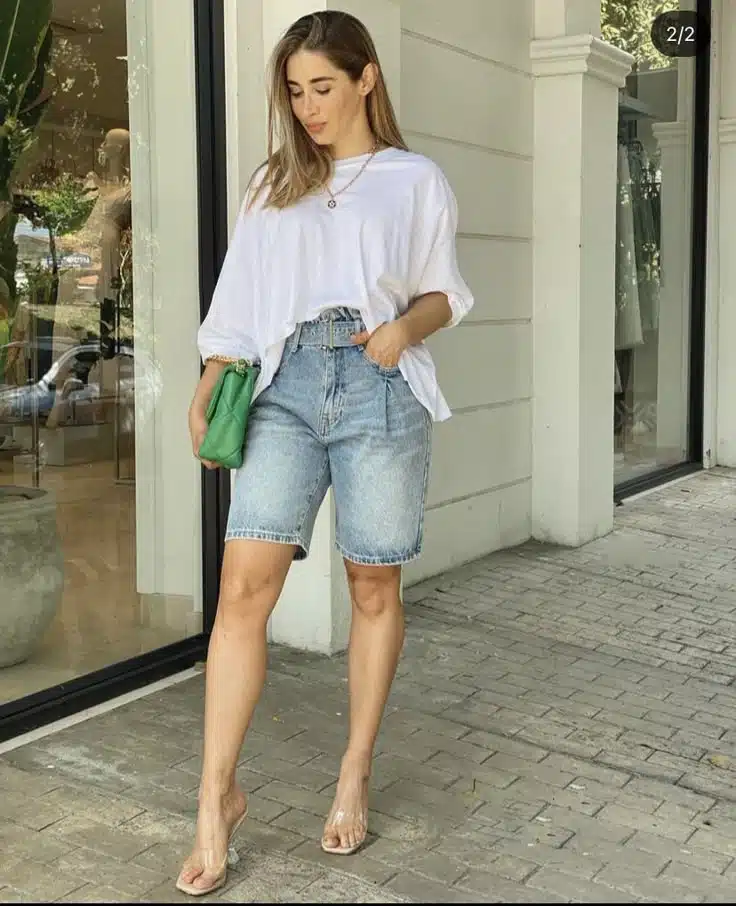 Esse é o clássico que nunca falha. A combinação de bermuda jeans com camiseta básica é simples, mas extremamente eficiente. O segredo está nos detalhes: escolha uma camiseta de boa qualidade, com caimento perfeito, e finalize com acessórios.