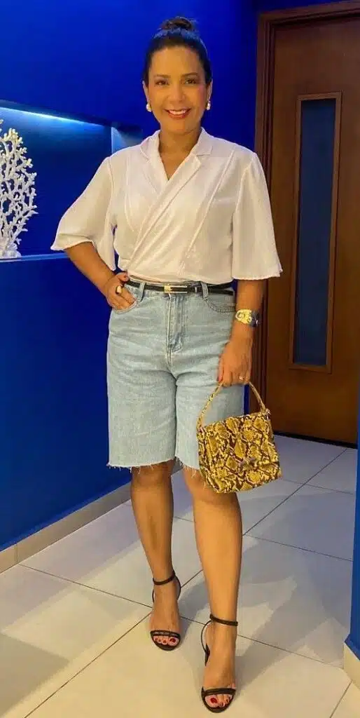 Sim, é possível usar bermuda jeans de forma elegante. Basta adicionar um salto alto. Pode ser uma sandália, scarpin ou mule.