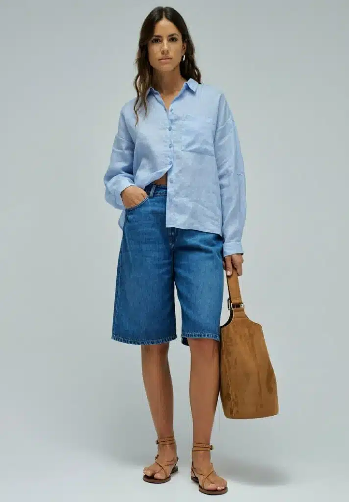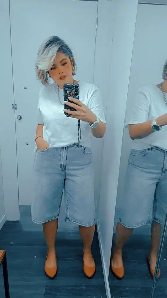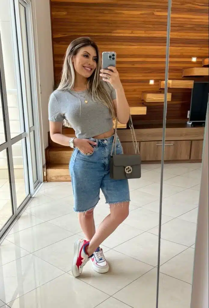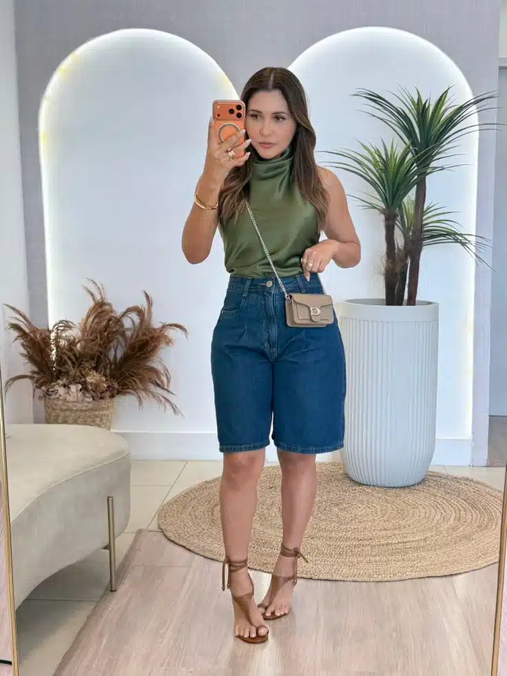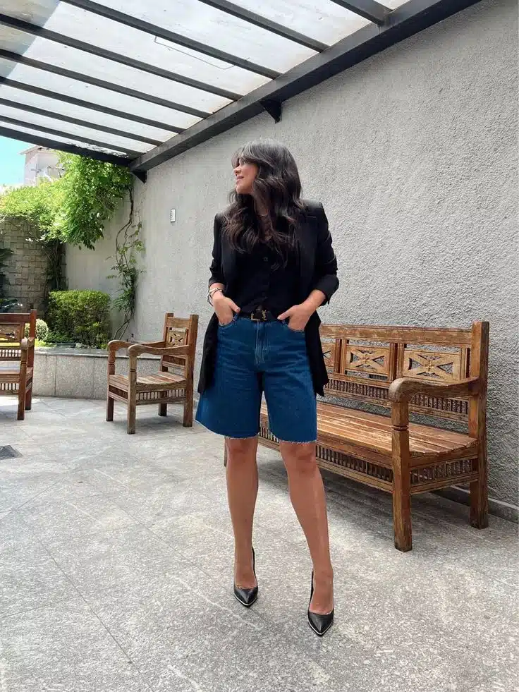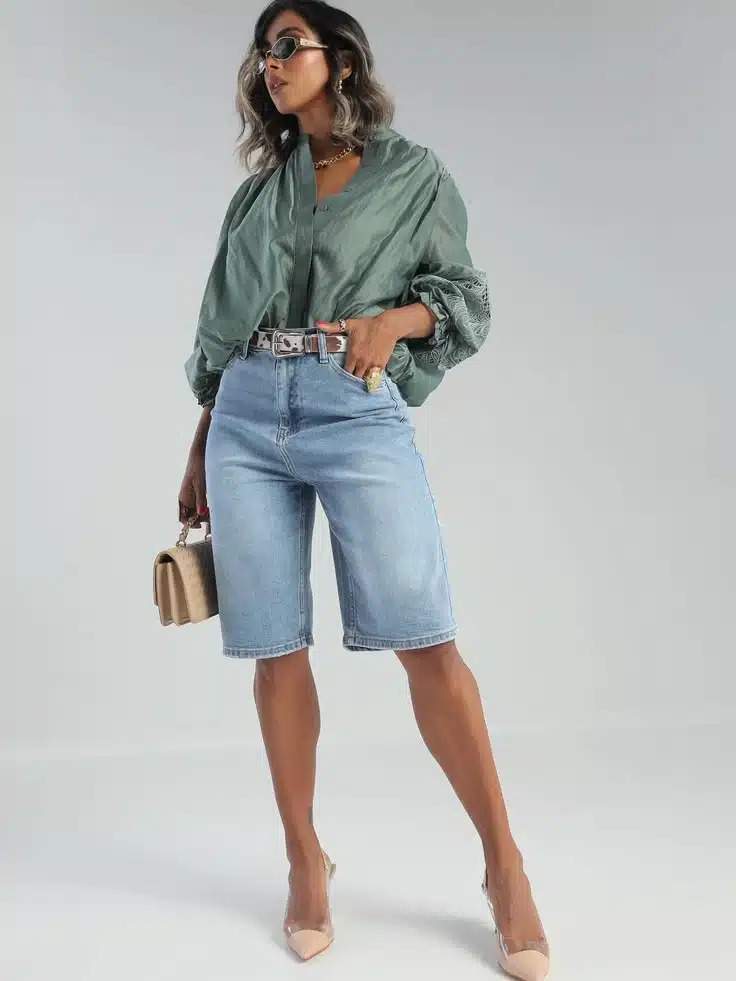 A verdade é simples: a bermuda jeans precisa de equilíbrio. Se a parte de baixo é mais casual, a parte de cima pode trazer sofisticação — e vice-versa. Esse contraste é o que transforma o look.